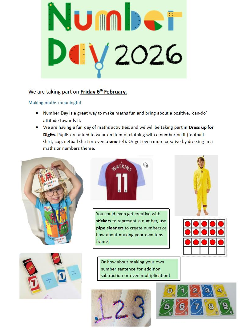 6th February - Maths dress up day – dress as a number! Further details will be sent out about this event by Mrs Rudge, our Maths leader.